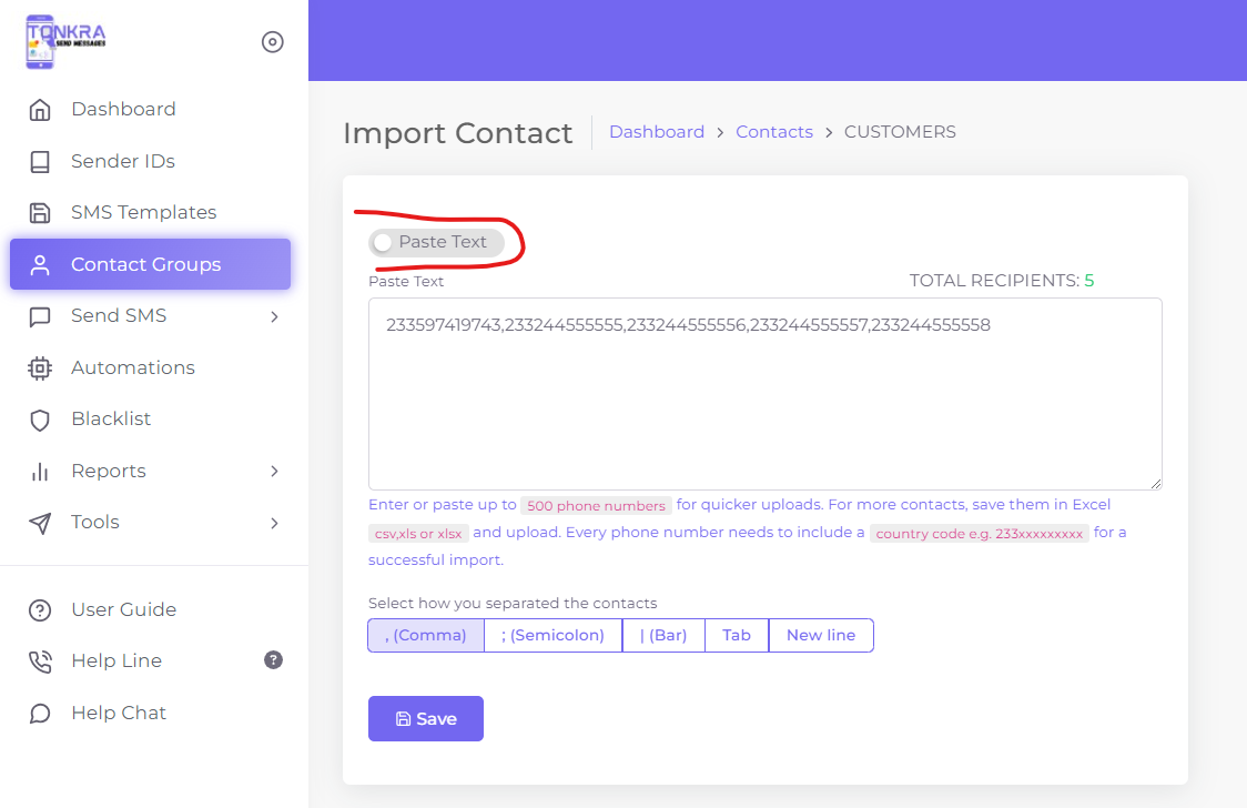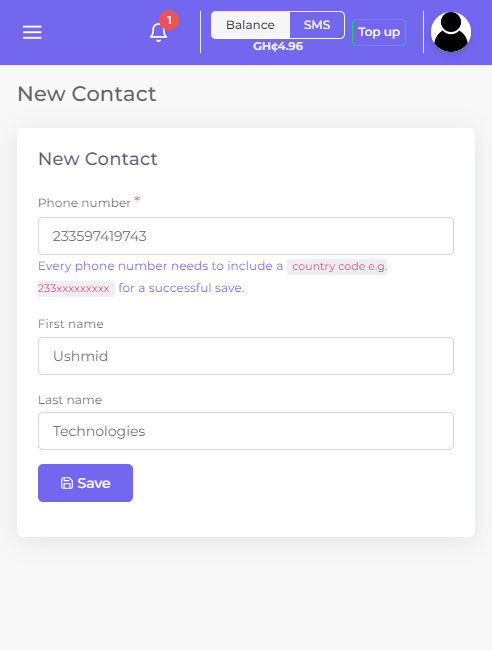 - Note: This way, you will have to enter only Phone numbers, and should begin with the country code without + or 0 e.g. 233597419743