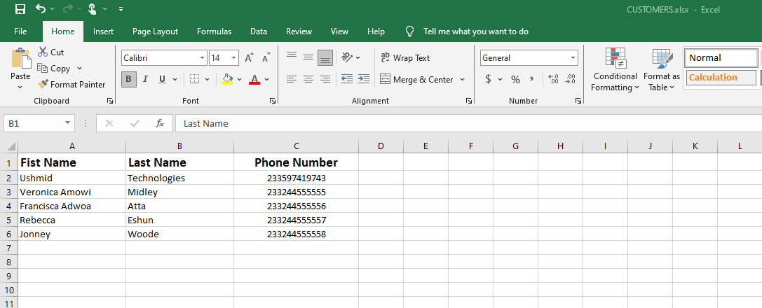 - Note: File must have phone number column and must be in country code format e.g. 233xxxxxxxxx Supported file types are: Excel csv, xls, xlsx Supported Date Columns, formats are: 2/1/90, 2/1/1990, and 1990-01-21.